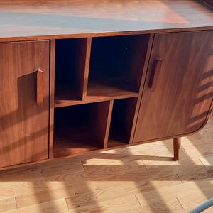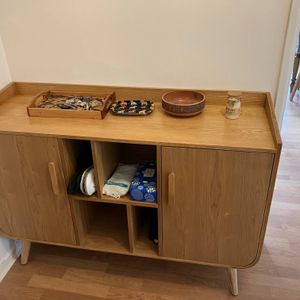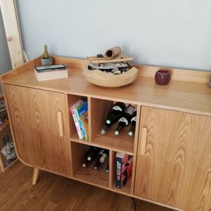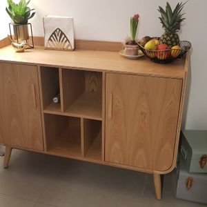 petit buffet bas en bois foncé noyer (dimensions totales L122 x P40 x H86 cm) possède deux portes, dont chacune d'elle renferme une étagère. Parfait pour entreposer votre vaisselle ! Au centre,
