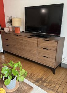 Buffet vintage finition bois foncé noyer et métal noir avec rangements L180 cm SARTO