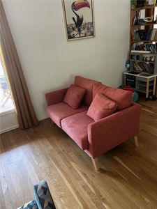 Canapé scandinave déhoussable 2 places en tissu velours rouge tomette et bois clair OSLO