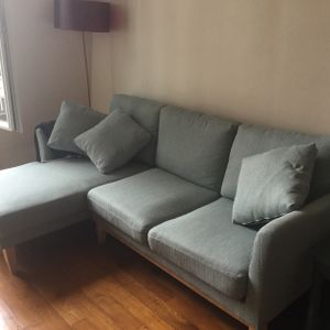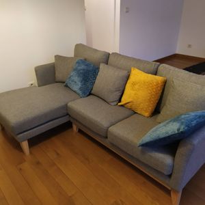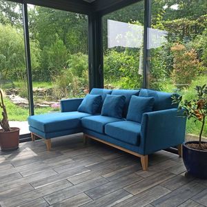 Canapé d'angle gauche scandinave en tissu beige déhoussable et bois clair 3-4 places OSLO