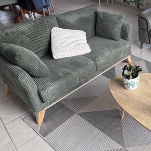 Canapé scandinave déhoussable 2 places en tissu effet velours texturé terracotta et bois clair OSLO