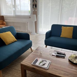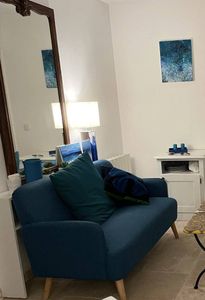 petit canapé bleu canard n'encombre pas l'espace. Seul ou associé au
