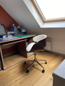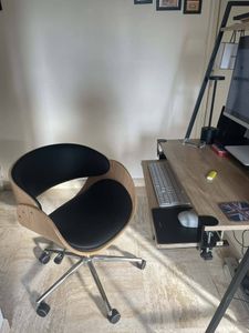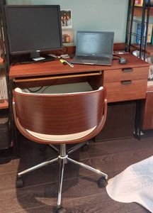 Chaise de bureau à roulettes design en tissu gris, bois clair et acier chromé BENT