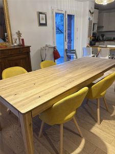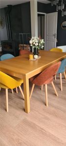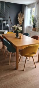 Proposées dans une jolie palette de couleurs, ces chaises en tissu et bois se multiplient à l'envi autour de la table à manger.