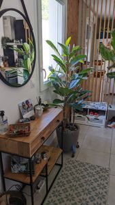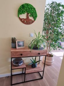 Cette console artisanale en bois massif arbore le cachet unique du "fait main". Habillez-la de plantes et d'une jolie lampe à poser pour une signature très déco !
