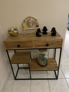 Composée d'une structure en métal et de différents plateaux en acacia, cette console en bois et métal noir munie de 2 tiroirs et 2 plateaux étagères vous accompagne autant dans une entrée que dans un pièce de vie. Idéale pour se concocter un coin déco tout en organisant l'espace, cette console avec rangements offre des espaces fermés et ouverts pour garder à portée de mains les objets du quotidien !