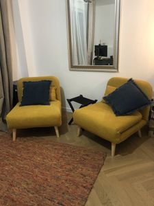 Fauteuil convertible scandinave en tissu effet velours jaune moutarde et bois clair AMIKO