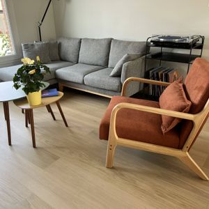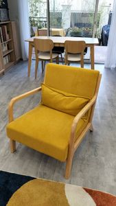 Fauteuil jaune moutarde et bois livré prêt à monter.