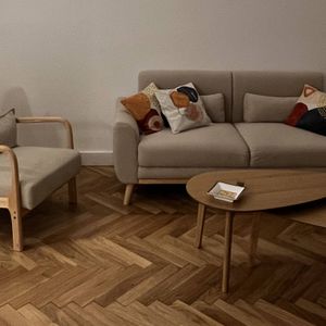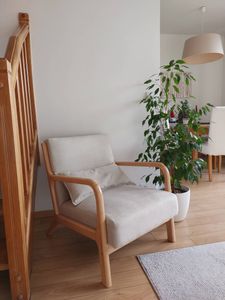 Parce qu'un fauteuil scandinave doit rimer avec confort, le cadre robuste en hévéa massif contraste tout en douceur avec le siège profond et le haut dossier. Rembourrée d'une agréable mousse densité 28 kg/m³, l'assise gagne en volume lorsqu'elle est complétée par son coussin d'appoint assorti. Sans fausse note, le piètement arrière légèrement incliné vous promet de doux moments relaxants confortablement installé.