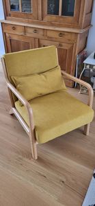 Fauteuil terre brûlée et bois livré prêt à monter.