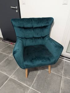 grand fauteuil vert de gris et bois clair réunit également larges accoudoirs et dossier haut, le parfait combo pour tous ceux qui aiment se lover dans leur fauteuil de salon. Le