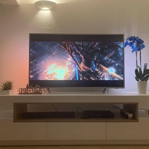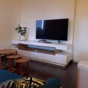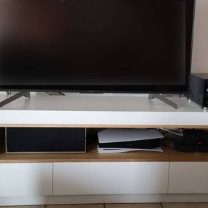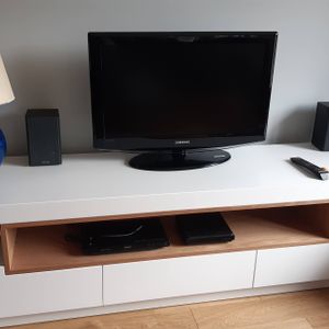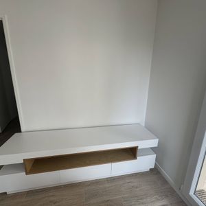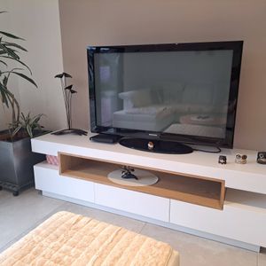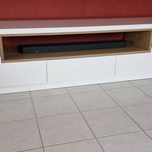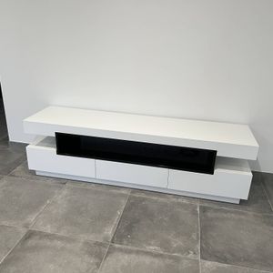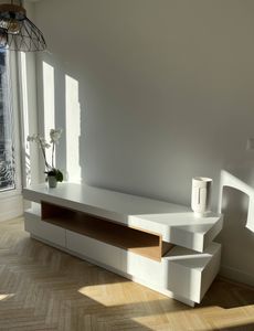 Meuble TV design blanc laqué brillant et bois L200 cm LIVO