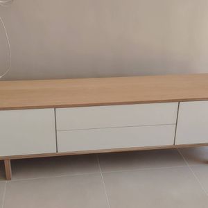 meuble TV SID associe le bois clair au blanc pour des couleurs naturelles et lumineuses qui donneront de suite un coup d'éclat et de lumière à une pièce un peu trop sombre. Si vous aimez le style nordique/scandinave, ce meuble contemporain sublimera votre intérieur.