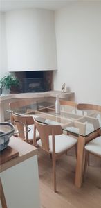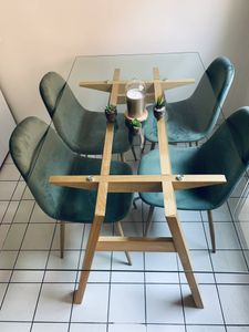 Table à manger en verre et bois clair livrée prête à monter.