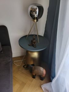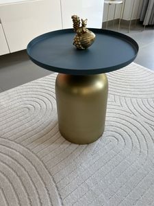 Cette table 100% métal est issue d'un joli travail sur la matière. On aime ses lignes rondes, simples et massives et ses volumes parfaitement équilibrés. Le pied cylindrique en métal doré contraste brillamment avec le plateau de couleur bleu pétrole mat.