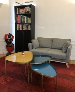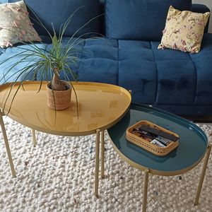 trois tables basses gigognes crée un style sophistiqué. Elle est associée à un plateau travaillé avec des courbes pour un salon tout en douceur. Des