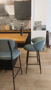 Tabourets de bar design en tissu effet velours texturé vert céladon et métal noir (lot de 2) ROSALIE